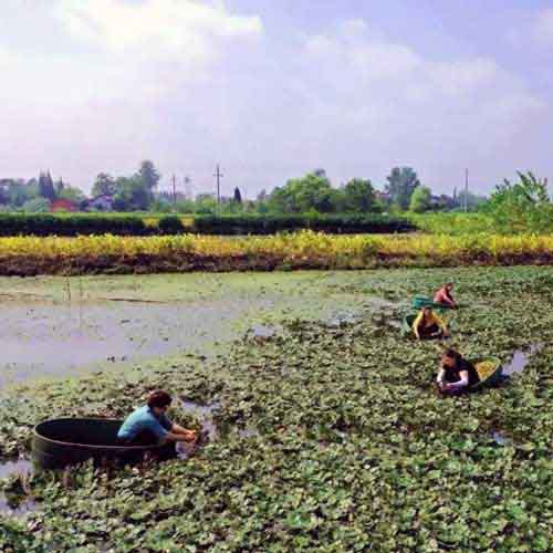 每當秋季,邵伯鎮大小湖塘的水面上,全是碧綠一片,只見“叢叢菱葉隨波起,朵朵菱花背日開”,像是鋪了一層翡翠,密密匝匝,簇簇擁擁。采菱女漫身在木盆中,紅衣綠葉,暖風美喉,如在畫中游動。只見,遠處,碧波一湯漾,飛蜓野荷;岸上,壟田阡陌,煙村疏林;近旁,青菱白花,搖曵生姿,構成了一幅秋日特有的旖旎圖畫,成了邵伯一道亮麗的風景線。